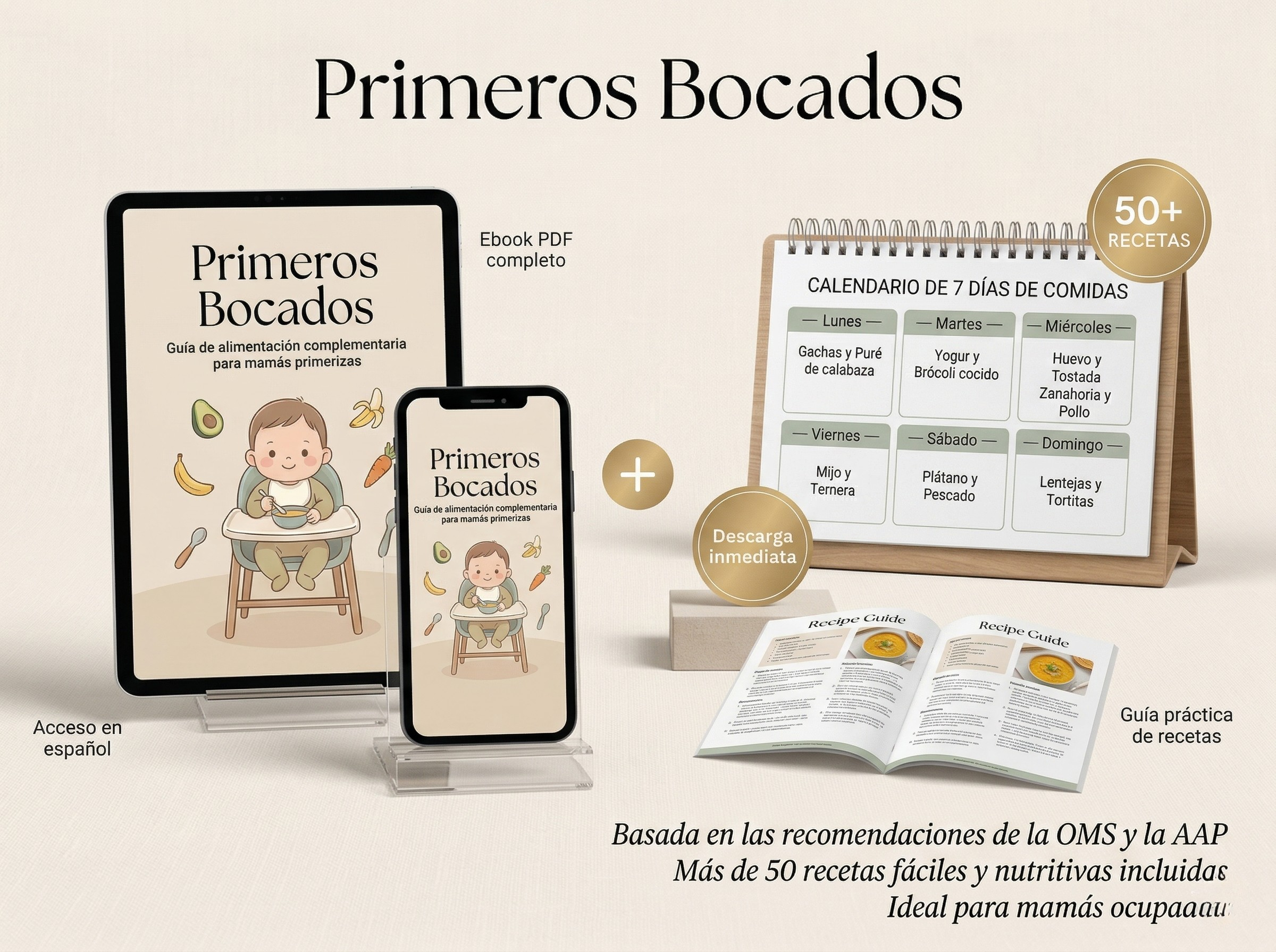 Una guía cálida y práctica para mamás que van empezando la alimentación complementaria. Deja de leer respuestas contradictorias en internet: te damos instrucciones simples y seguras para introducir comida sólida a tu bebé —avaladas por la OMS y la AAP—. Se acabó el estrés, porque este paquete incluye más de 50 recetas fáciles y un Calendario de 7 Días para tu primera semana juntas.